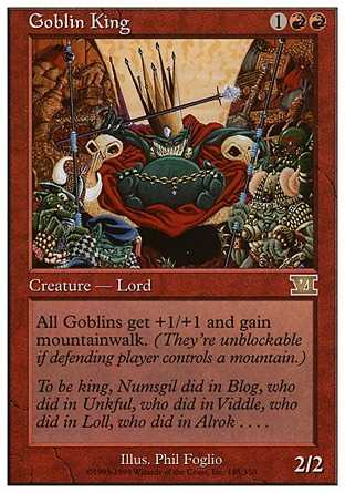 | Card Text | Other Goblin creatures get +1/+1 and have mountainwalk. (They can"t be blocked as long as defending player controls a Mountain.) |
