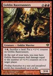 | Card Text | ![]() , Sacrifice a land: Put a +1/+1 counter on Goblin Razerunners.At the beginning of your end step, you may have Goblin Razerunners deal damage equal to the number of +1/+1 counters on it to target player. |