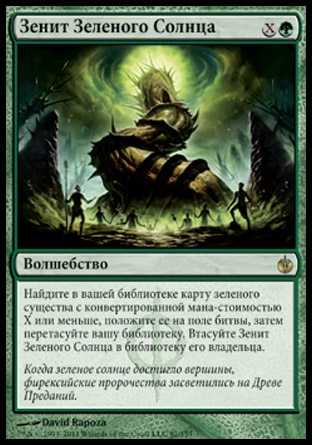 | Card Text | Search your library for a green creature card with converted mana cost X or less, put it onto the battlefield, then shuffle your library. Shuffle Green Sun"s Zenith into its owner"s library. |