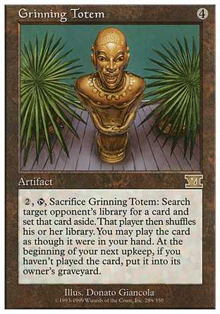 Card Text, , Sacrifice Grinning Totem: Search target opponent"s library for a card and exile it. Then that player shuffles his or her library. Until the beginning of your next upkeep, you may play that card. At the beginning of your next upkeep, if you haven"t played it, put it into its owner"s graveyard.