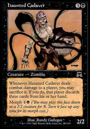 Card TextWhenever Haunted Cadaver deals combat damage to a player, you may sacrifice it. If you do, that player discards three cards.