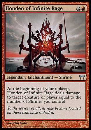 | Card Text | At the beginning of your upkeep, Honden of Infinite Rage deals damage to target creature or player equal to the number of Shrines you control. |