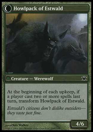 | Card Text | At the beginning of each upkeep, if a player cast two or more spells last turn, transform Howlpack of Estwald. |