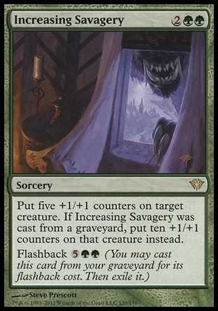 | Card Text | Put five +1/+1 counters on target creature. If Increasing Savagery was cast from a graveyard, put ten +1/+1 counters on that creature instead. Flashback |