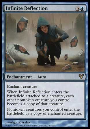 | Card Text | Enchant creature When Infinite Reflection enters the battlefield attached to a creature, each other nontoken creature you control becomes a copy of that creature. Nontoken creatures you control enter the battlefield as a copy of enchanted creature. |