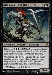 | Card Text | Ninjutsu ![]() ![]() (![]() ![]() , Return an unblocked attacker you control to hand: Put this card onto the battlefield from your hand tapped and attacking.)Whenever Ink-Eyes, Servant of Oni deals combat damage to a player, you may put target creature card from that player"s graveyard onto the battlefield under your control.