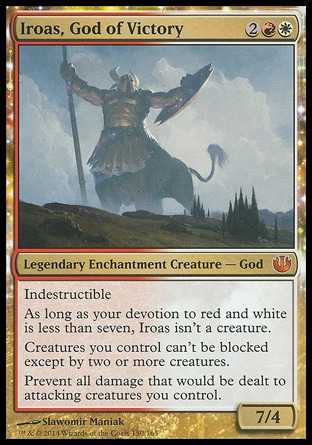 | Card Text | Indestructible As long as your devotion to red and white is less than seven, Iroas isn"t a creature. Creatures you control can"t be blocked except by two or more creatures. Prevent all damage that would be dealt to attacking creatures you control. |