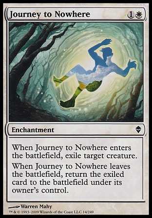 | Card Text | When Journey to Nowhere enters the battlefield, exile target creature. When Journey to Nowhere leaves the battlefield, return the exiled card to the battlefield under its owner"s control. |