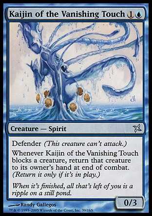 | Card Text | Defender (This creature can"t attack.) Whenever Kaijin of the Vanishing Touch blocks a creature, return that creature to its owner"s hand at end of combat. (Return it only if it"s on the battlefield.) |