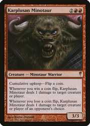 | Card Text | Cumulative upkeep-Flip a coin. (At the beginning of your upkeep, put an age counter on this permanent, then sacrifice it unless you pay its upkeep cost for each age counter on it.) Whenever you win a coin flip, Karplusan Minotaur deals 1 damage to target creature or player. Whenever you lose a coin flip, Karplusan Minotaur deals 1 damage to target creature or player of an opponent"s choice. |