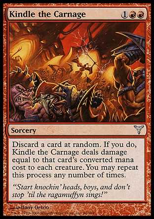 | Card Text | Discard a card at random. If you do, Kindle the Carnage deals damage equal to that card"s converted mana cost to each creature. You may repeat this process any number of times. |