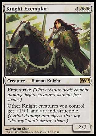 | Card Text | First strike (This creature deals combat damage before creatures without first strike.) Other Knight creatures you control get +1/+1 and have indestructible. (Damage and effects that say |