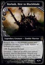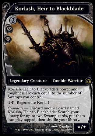 Grandeur - Discard another card named Korlash, Heir to Blackblade: Search your library for up to two Swamp cards, put them onto the battlefield tapped, then shuffle your library. |