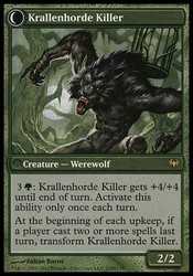 | Card Text | ![]() : Krallenhorde Killer gets +4/+4 until end of turn. Activate this ability only once each turn.At the beginning of each upkeep, if a player cast two or more spells last turn, transform Krallenhorde Killer. |