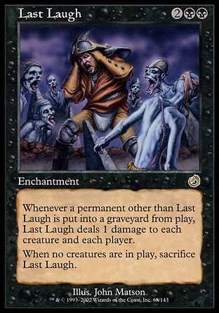 Card TextWhenever a permanent other than Last Laugh is put into a graveyard from the battlefield, Last Laugh deals 1 damage to each creature and each player.