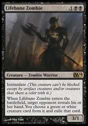 | Card Text | Intimidate (This creature can"t be blocked except by artifact creatures and/or creatures that share a color with it.) When Lifebane Zombie enters the battlefield, target opponent reveals his or her hand. You choose a green or white creature card from it and exile that card. |