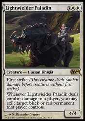 | Card Text | First strike (This creature deals combat damage before creatures without first strike.) Whenever Lightwielder Paladin deals combat damage to a player, you may exile target black or red permanent that player controls. |
