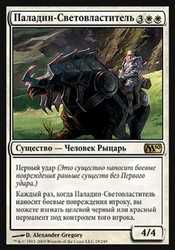 | Card Text | First strike (This creature deals combat damage before creatures without first strike.) Whenever Lightwielder Paladin deals combat damage to a player, you may exile target black or red permanent that player controls. |