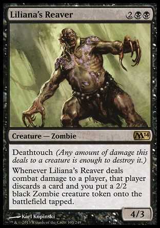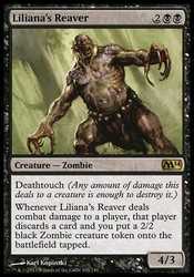 | Card Text | Deathtouch Whenever Liliana"s Reaver deals combat damage to a player, that player discards a card and you put a 2/2 black Zombie creature token onto the battlefield tapped. |