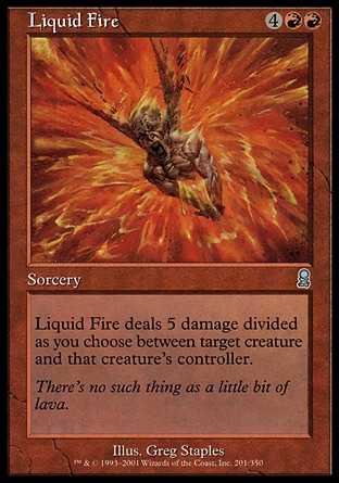 Liquid Fire deals X damage to target creature and 5 minus X damage to that creature"s controller, where X is the chosen number.