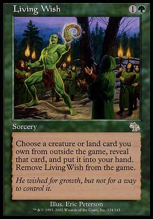 | Card Text | You may choose a creature or land card you own from outside the game, reveal that card, and put it into your hand. Exile Living Wish. |