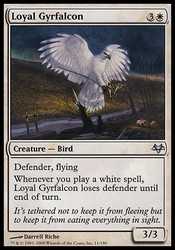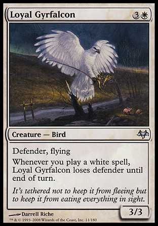 Whenever you cast a white spell, Loyal Gyrfalcon loses defender until end of turn.