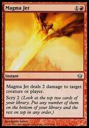 | Card Text | Magma Jet deals 2 damage to target creature or player. Scry 2. (Look at the top two cards of your library, then put any number of them on the bottom of your library and the rest on top in any order.) |