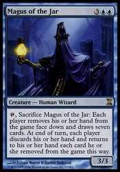 | Card Text | , Sacrifice Magus of the Jar: Each player exiles all cards from his or her hand face down and draws seven cards. At the beginning of the next end step, each player discards his or her hand and returns to his or her hand each card he or she exiled this way. |