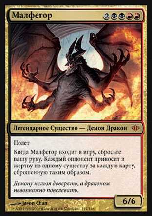 | Card Text | Flying When Malfegor enters the battlefield, discard your hand. Each opponent sacrifices a creature for each card discarded this way. |