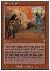 Card TextYou and target opponent each flip a coin. Mana Clash deals 1 damage to each player whose coin comes up tails. Repeat this process until both players" coins come up heads on the same flip.