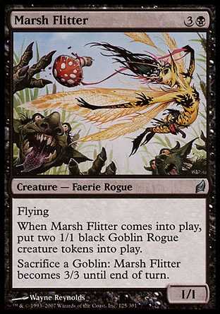| Card Text | Flying When Marsh Flitter enters the battlefield, put two 1/1 black Goblin Rogue creature tokens onto the battlefield. Sacrifice a Goblin: Marsh Flitter has base power and toughness 3/3 until end of turn. |