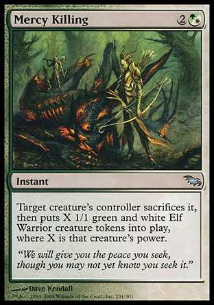 | Card Text | Target creature"s controller sacrifices it, then puts X 1/1 green and white Elf Warrior creature tokens onto the battlefield, where X is that creature"s power. |