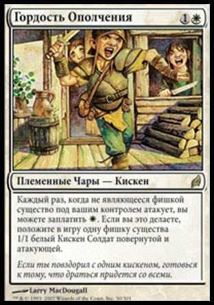 | Card Text | Whenever a nontoken creature you control attacks, you may pay . If you do, put a 1/1 white Kithkin Soldier creature token onto the battlefield tapped and attacking. |
