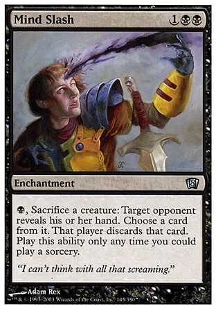 Card Text, Sacrifice a creature: Target opponent reveals his or her hand. You choose a card from it. That player discards that card. Activate this ability only any time you could cast a sorcery.