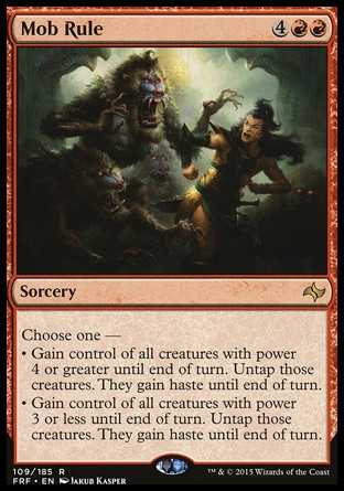 | Card Text | Choose one - • Gain control of all creatures with power 4 or greater until end of turn. Untap those creatures. They gain haste until end of turn. • Gain control of all creatures with power 3 or less until end of turn. Untap those creatures. They gain haste until end of turn. |
