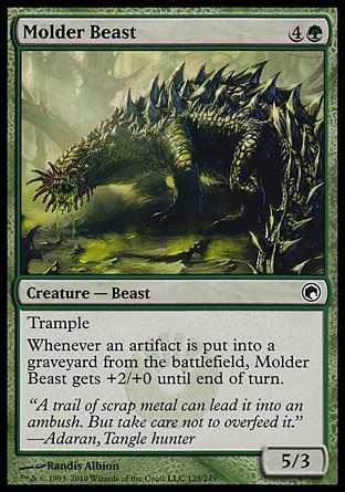 | Card Text | Trample Whenever an artifact is put into a graveyard from the battlefield, Molder Beast gets +2/+0 until end of turn. |
