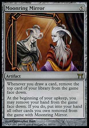At the beginning of your upkeep, you may exile all cards from your hand face down. If you do, put all other cards you own exiled with Moonring Mirror into your hand.