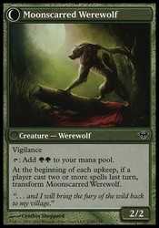 At the beginning of each upkeep, if a player cast two or more spells last turn, transform Moonscarred Werewolf. |