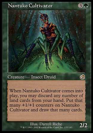 Card TextWhen Nantuko Cultivator enters the battlefield, you may discard any number of land cards. Put that many +1/+1 counters on Nantuko Cultivator and draw that many cards.