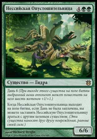 | Card Text | Tribute 6 (As this creature enters the battlefield, an opponent of your choice may place six +1/+1 counters on it.) When Nessian Wilds Ravager enters the battlefield, if tribute wasn"t paid, you may have Nessian Wilds Ravager fight another target creature. (Each deals damage equal to its power to the other.) |