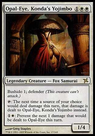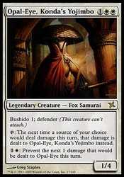 : The next time a source of your choice would deal damage this turn, that damage is dealt to Opal-Eye, Konda"s Yojimbo instead.