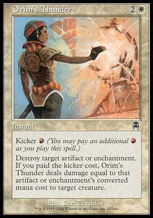| Card Text | Kicker (You may pay an additional as you cast this spell.)Destroy target artifact or enchantment. If Orim"s Thunder was kicked, it deals damage equal to that permanent"s converted mana cost to target creature. |