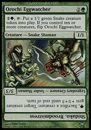 | Card Text | ![]() , : Put a 1/1 green Snake creature token onto the battlefield. If you control ten or more creatures, flip Orochi Eggwatcher. |