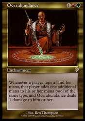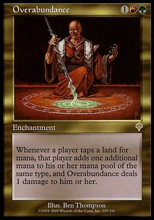 | Card Text | Whenever a player taps a land for mana, that player adds one mana to his or her mana pool of any type that land produced, and Overabundance deals 1 damage to him or her. |