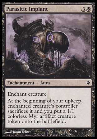 At the beginning of your upkeep, enchanted creature"s controller sacrifices it and you put a 1/1 colorless Myr artifact creature token onto the battlefield.
