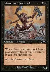 Card TextWhen Phyrexian Bloodstock leaves the battlefield, destroy target white creature. It can"t be regenerated.