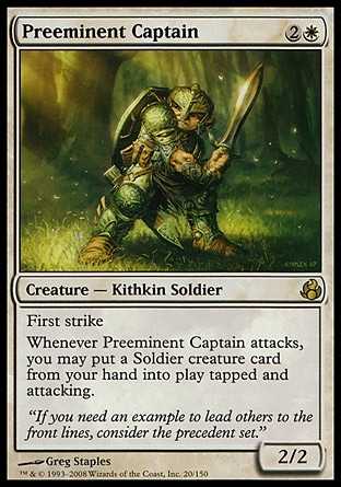 Whenever Preeminent Captain attacks, you may put a Soldier creature card from your hand onto the battlefield tapped and attacking.
