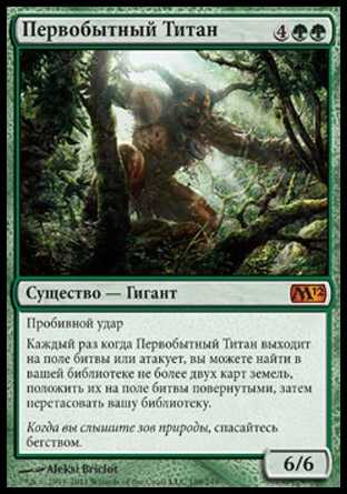 | Card Text | Trample Whenever Primeval Titan enters the battlefield or attacks, you may search your library for up to two land cards, put them onto the battlefield tapped, then shuffle your library. |