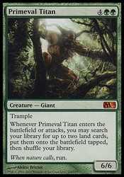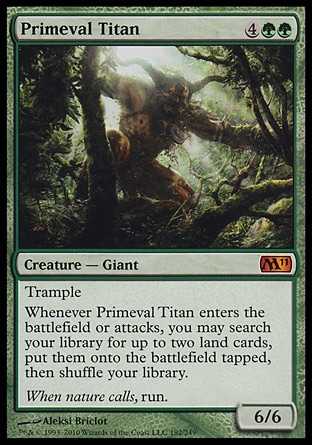 | Card Text | Trample Whenever Primeval Titan enters the battlefield or attacks, you may search your library for up to two land cards, put them onto the battlefield tapped, then shuffle your library. |