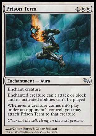 | Card Text | Enchant creature Enchanted creature can"t attack or block, and its activated abilities can"t be activated. Whenever a creature enters the battlefield under an opponent"s control, you may attach Prison Term to that creature. |